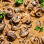 - Add ¾ cups onions, 3 tbsps garlic, and 1½ lbs mushrooms and saute until mushrooms are tender.